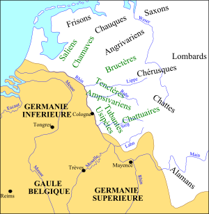 - Salian Franks (originally they inhabited the northern Low Rhine area, specifically today's Salland, later they expanded in the Low Countries, and most stayed there; even later, many migrated outside Eastern Austrasia, that included Rhineland, and beyond Silva Carbonaria and the Arduenna Silva, outside the original area of Frankish settlement where Gallo-Romans were the majority, scattered throughout the territory of the Kingdom of the Franks, roughly today's France, especially the northern regions, Western Austrasia and Neustria, they were later assimilated by the Gallo-Roman majority) (later, those that stayed in Salland, were conquered and assimilated by the Saxons)