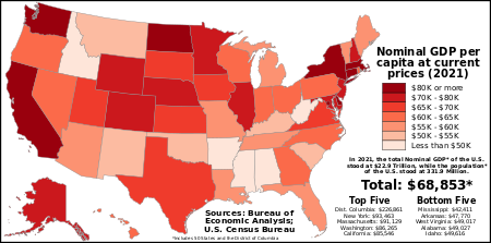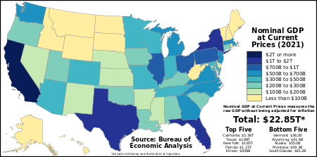 The table below lists the annual Nominal GDP of each U.S. state and the District of Columbia in 2022, as well as the GDP change and GDP per capita for that year. The list is initially sorted by Nominal GDP in 2021, but clicking the table headers can sort any column.[1][3] The total for "United States" in this table excludes the U.S. territories.