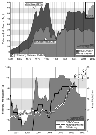 حقل الغوار السعودية 1948[1] 1951[1] 2005,[2] متنازع عليه[3] 75-83[4][5] 5[6] 8% per year[بحاجة لمصدر]