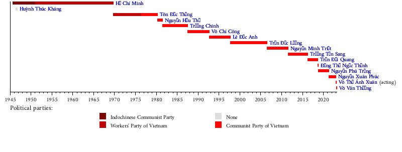 This is a list of those who have served as president of the Socialist Republic of Vietnam (ڤيتنامية: Chủ tịch nước Cộng hòa xã hội chủ nghĩa Việt Nam) from the establishment of the position to the present. Since Vietnam is a single-party state, the president is generally considered to hold the second highest position in the political system, after the general secretary of the Communist Party of Vietnam. In its current incarnation the president is the head of state of the Socialist Republic of Vietnam, as well as the head of government in tandem with prime minister. The president represents Vietnam internally and externally, supervises the work as well as preserving the stability of the national governmental system and safeguards the independence and territorial integrity of the country. The president appoints prime minister, vice-presidents, ministers and other officials with the consent of the National Assembly. The head of state is the de jure commander-in-chief of the Vietnam People's Armed Forces and Chairman of the Council for Defence and Security, an organ of the National Assembly. Since Vietnam is a one-party state, with the Communist Party of Vietnam being the sole party allowed by the constitution, all the presidents of the Democratic Republic and the Socialist Republic have been members of the party while holding office. The current interim President is Võ Thị Ánh Xuân since the resignation of Nguyễn Xuân Phúc on 18 January 2023.