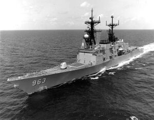 The first major warship produced by the U.S. Navy after World War II (and in the Cold War) were "frigates"—the ships were originally designated destroyer leaders but reclassified in 1975 as guided missile cruisers (except the Farragut، طراز became guided missile destroyers). These grew out of the last all-gun destroyers of the 1950s. In the middle 1970s the Spruance، طراز destroyers entered service, optimized for anti-submarine warfare. A special class of guided missile destroyers was produced for the Shah of Iran, but due to the Iranian Revolution these ships could not be delivered and were added to the U.S. Navy.