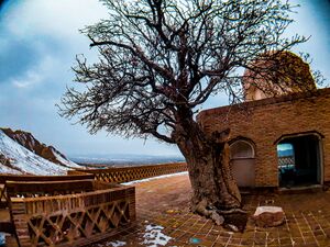 ![]() قبر بزرمهر قائني يضم شجرة بانه عمرها 700 عام. |