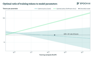 Optimal ratio of training tokens to model parameters for Chinchilla scaling law. It shows that in general, "Chinchilla optimal" scaling is , and is significantly different from (Hoffmann et al., 2022). Data analysis by Epoch AI.[13]