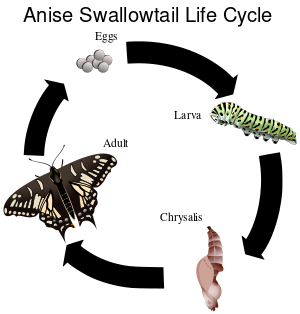 Species of Lepidoptera undergo holometabolism or "complete metamorphosis". Their life cycle normally consists of an egg, a larva, a pupa, and an imago or adult.[15] The larvae are commonly called caterpillars, and the pupae of moths encapsulated in silk are called cocoons, while the uncovered pupae of butterflies are called chrysalides.