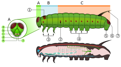 The larvae or caterpillars are the first stage in the life cycle after hatching. Caterpillars are "characteristic polypod larvae with cylindrical bodies, short thoracic legs, and abdominal prolegs (pseudopods)".[47] They have a sclerotized head capsule with an adfrontal suture formed by medial fusion of the sclerites, mandibles (mouthparts) for chewing, and a soft tubular, segmented body, that may have hair-like or other projections, three pairs of true legs, and additional prolegs (up to five pairs).[48] The body consists of thirteen segments, of which three are thoracic and ten are abdominal.[49] Most larvae are herbivores, but a few are carnivores (some eat ants or other caterpillars) and detritivores.[48]