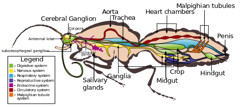 In the circulatory system, hemolymph, or insect blood, is used to circulate heat in a form of thermoregulation, where muscles contraction produces heat, which is transferred to the rest of the body when conditions are unfavorable.[36] In lepidopteran species, hemolymph is circulated through the veins in the wings by some form of pulsating organ, either by the heart or by the intake of air into the trachea.[34]