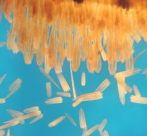 The eggs are derived from materials ingested as a larva and in some species, from the spermatophores received from males during mating.[45] An egg can only be 1/1000 the mass of the female, yet she may lay up to her own mass in eggs. Females lay smaller eggs as they age. Larger females lay larger eggs.[46] The egg is covered by a hard-ridged protective outer layer of shell, called the chorion. It is lined with a thin coating of wax, which prevents the egg from drying out. Each egg contains a number of micropyles, or tiny funnel-shaped openings at one end, the purpose of which is to allow sperm to enter and fertilize the egg. Butterfly and moth eggs vary greatly in size between species, but they are all either spherical or ovate.