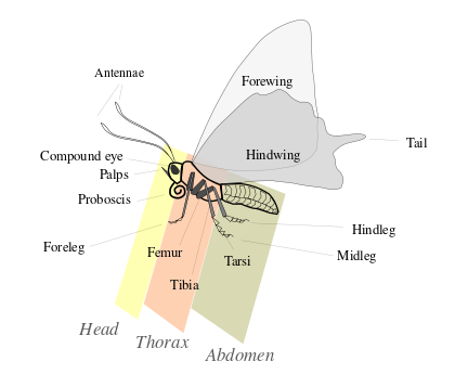 Lepidoptera are morphologically distinguished from other orders principally by the presence of scales on the external parts of the body and appendages, especially the wings. Butterflies and moths vary in size from microlepidoptera only a few millimeters long, to conspicuous animals with a wingspan greater than 25 سنتيمتر (9.8 in), such as the Queen Alexandra's birdwing and Atlas moth.[24] Lepidopterans undergo a four-stage life cycle: egg; larva or caterpillar; pupa or chrysalis; and imago (plural: imagines) / adult and show many variations of the basic body structure, which give these animals advantages for diverse lifestyles and environments.