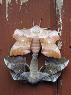 Males usually start eclosion (emergence) earlier than females and peak in numbers before females. Both of the sexes are sexually mature by the time of eclosion.[26] Butterflies and moths normally do not associate with each other, except for migrating species, staying relatively asocial. Mating begins with an adult (female or male) attracting a mate, normally using visual stimuli, especially in diurnal species like most butterflies. However, the females of most nocturnal species, including almost all moth species, use pheromones to attract males, sometimes from long distances.[15] Some species engage in a form of acoustic courtship, or attract mates using sound or vibration such as the polka-dot wasp moth, Syntomeida epilais.[43]