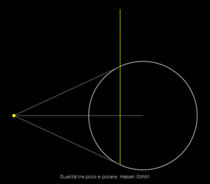 ان العلاقة التبادلية بين النقطة والخط بالنسبة لقطع مخروطي، تتلخص في انه عندما يتم إعطاء قطع مخروطي دلتا ونقطة P. كل نقطة P من المستوى يقابلها خط قطبي p والعكس صحيح. وعندما تتحرك نقطة M على طول الخط p ، يدور الخط القطبي لـ M حول القطب P للخط p. [1]