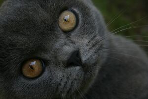 A young British Blue male showing the copper eyes typical of cats with 'blue' fur
