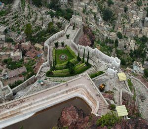 - الجزء الأول ويسمى "العدينة" ويضم حدائق معلقة على هيئة مدرجات شيدت في المنحدر الجبلي وسداً مائياً وأحواضاً نحتت وشيدت في إحدى واجهات الجبل فضلاً عن القصور التي تتناثر في أرجائه محاطة بالأبراج والمنتزهات. وفي هذا الجزء توجد أربعة قصور هي دار الأدب. دار الشجرة. دار العدل. دار الإمارة والأخير كان خاصاً بالملك إلى قصر الضيافة وهو خاص باستقبال الضيوف ناهيك عن الأنفاق التي تربط القصور بالخارج بأنفاق وممرات سرية.