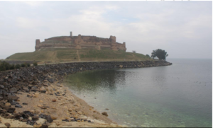 ![]() قلعة جعبر من الشمال، محاطة بمياه بحيرة الأسد | |