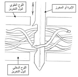 تتم عملية التخريز بتمرير شبكة موضعة هوائيًا خلال نول الإبر عدة مرات لإعطاء المتانة والبنية اللازمتان. نول الإبر عبارة عن لوحين مجهزين بإبر خاصة ذات نتوءات مختلفة الإتجاهات تعمل على سحب الألياف معها ذهابًا وإيابًا لتدخلهم في جسم الشبكة. يتم تماسك هذا النوع من اللانسيج بفعل الاحتكاك بين الألياف. هذه العملية رخيصة. يمكن استعمال إبر ساخنة في حالة تخريز الألياف الاصطناعية، حيث تساعد الحرارة على صهر بعض الألياف مع بعضها.