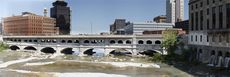 ![]() On the Erie Canal Aqueduct looking north below Broad Street, downtown Rochester The Aqueduct is divided by the concrete support for the Broad Street Bridge above. |