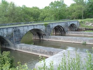 ![]() Erie Canal Aqueduct crossing the Genesee River in Rochester، نيويورك. Broad Street now runs atop it. A proposed rewatering project of the Erie Canal Aqueduct to connect to a round lock on the Genesee River is under review. This revitalization project will also facilitate boating. |