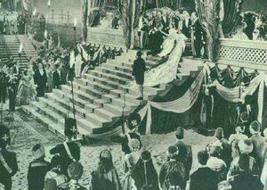 في الثانية بعد ظهر يوم 16 نوفمبر أخذ المدعوون يتقدمون نحو الإيوان والمظلات حتى جلس كل في مكانه فتوسطت الإمبراطورة أوجيني الصف الأول وإلى يمينها إمبراطور النمسا والخديوي إسماعيل ثم ولي عهد بروسيا فولي عهد هولندا وعقيلته وإلى يساره جلست مدام اليوت عقيلة سفير إنجلترا بتركيا (الذي وكله السلطان بذكر اسمه عند افتتاح القناة) فالسفير إليوت فالأميرة مورا، وعلى اليمين جلس الأمير محمد توفيق باشا ولي عهد مصر فالأمير هوفمان لو فمدام أغنانيف فالجنرال أغنانيف.[9]