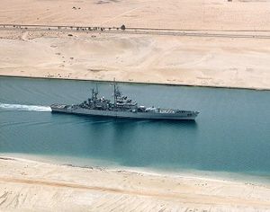 قناة السويس Suez Canal، هي ممر مائي إصطناعي في مستوى سطح البحر في مصر، يصل بين البحر المتوسط والبحر الأحمر. أُفتتح في نوفمبر 1869 بعد 10 سنوات من الإنشاء، يسمح للسفن بالسفر بين أوروپا وشرق آسيا بدون الإبحار حول أفريقيا. النهاية الشمالية هي بورسعيد؛ النهاية الجنوبية هي بورتوفيق عند مدينة السويس. تقع الإسماعيلية على الضفة الغربية للقناة، على بعد 3 كم من منتصف الطريق. عند بناؤها، كان طول القناة 164 كم وعمقها 8 أمتار. بعد الكثير من التوسعات، وصل طولها إلى 193.30 كم، وعمقها إلى 24 متر وعرضها إلى 205 متر.[1] تتألف من منفذ الدخول الشمالي بطول 22 كم، القناة نفسها بطول ومنفذ الدخول الجنوبي بطول 9 كم.[2]