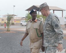 الميجور جنرال تري فرل، قائد قوة المهام المشتركة للقرن الأفريقي، والجنرال طاهر آدم علم، قائد القوات المسلحة الصومالية، يسيران معاً في معسكر ليمونيه، جيبوتي، مايو 2013.