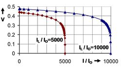 Solar cell voltage as a function of solar cell current delivered to a load for two light-induced currents IL; currents as a ratio with reverse saturation current I0. Compare with Fig. 1.4 in Nelson.[7]