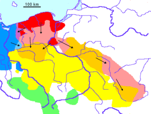 - blue: Jastorf culture (light blue: expansion, purple: repressed)
