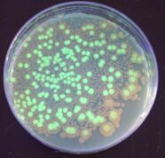 Right: Bacteria transformed with pGLO visualized under ultraviolet light