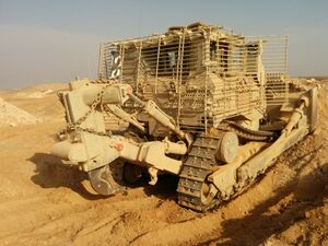Armored D9R bulldozers and unmanned "Raam HaShachar" D9N bulldozers played important role in the Second Lebanon War (2006) and Operation Cast Lead (2008–2009). Both bulldozer types were involved in opening routes, clearing explosives and IEDs, building sand mounds to protect AFVs and infantry camps, and demolishing structures such as rigged buildings, HQs, warehouses, outposts, bunkers and tunnels – often concealed in civilian structures.[8] In total, 100 D9s were deployed during Operation Cast Lead.[9]