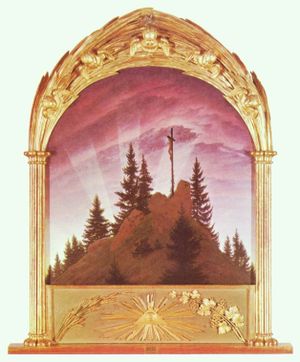 The Cross Beside The Baltic (1815), 45 × 33.5 cm. Schloss Charlottenburg, Berlin. This painting marked a move away by Friedrich from depictions in broad daylight, and a return to nocturnal scenes, twilight and a deeper poignancy of mood.[12]