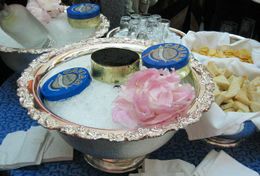 Salmon roe (left) and sturgeon caviar (right) served with mother of pearl caviar spoons to avoid tainting the taste of the caviar.