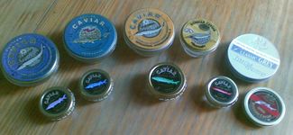 Russian and Iranian Caviar tins: Beluga to the left, Ossetra in the middle, Sevruga to the right.