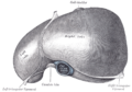 الكبد، منظر علوي، يظهر الفصين الأيمن والأيسر مفصولين عن طريق الرباط المنجلي.