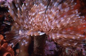 [[Image:SerpulidCyprusPliocene01.jpg|thumb|left|Tube of a serpulid worm attached to a branch of the coral