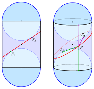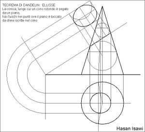 Using the Dandelin spheres, it can be proved that any conic section is the locus of points for which the distance from a point (focus) is proportional to the distance from the directrix.[7] Ancient Greek mathematicians such as Pappus of Alexandria were aware of this property, but the Dandelin spheres facilitate the proof.[6]
