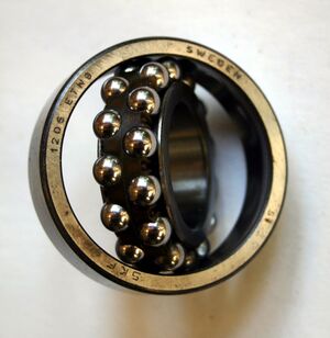 - Self-aligning ball bearings, such as the Wingqvist bearing shown in the picture, are constructed with the inner ring and ball assembly contained within an outer ring that has a spherical raceway. This construction allows the bearing to tolerate a small angular misalignment resulting from shaft or housing deflections or improper mounting. The bearing was used mainly in bearing arrangements with very long shafts, such as transmission shafts in textile factories.[6] One drawback of the self-aligning ball bearings is a limited load rating, as the outer raceway has very low osculation (its radius is much larger than the ball radius). This led to the invention of the spherical roller bearing, which has a similar design, but uses rollers instead of balls. The spherical roller thrust bearing is another invention derived from the findings by Wingqvist.