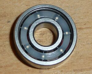 - These bearings make use of both ceramic balls and race. These bearings are impervious to corrosion and rarely require lubrication if at all. Due to the stiffness and hardness of the balls and race these bearings are noisy at high speeds. The stiffness of the ceramic makes these bearings brittle and liable to crack under load or impact. Because both ball and race are of similar hardness, wear can lead to chipping at high speeds of both the balls and the race, which can cause sparking.