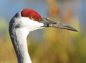 The bare area of skin on the face of a Sandhill Crane. This can change colour or even expand in area when the bird is excited