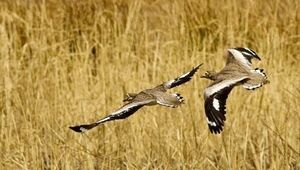 Senegal thick-knees are medium-large waders with strong black and yellow black bills, large yellow eyes — which give them a reptilian appearance — and cryptic plumage. They are similar but slightly smaller than the Eurasian stone-curlew, which winters in Africa. The long dark bill, single black bar on the folded wing, and darker cheek stripe are distinctions from the European species. Senegal thick-knee is striking in flight, with a broad white wing bar.