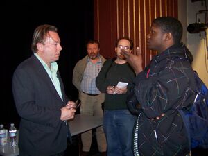 That year Hitchens began a series of written debates on the question "Is Christianity Good for the World?" with Christian theologian and pastor Douglas Wilson, published in Christianity Today magazine.[138] This exchange eventually became a book with the same title published in 2008. During their promotional tour of the book, they were accompanied by the producer Darren Doane's film crew. Thence Doane produced the film Collision: Is Christianity GOOD for the World?, which was released on 27 October 2009.[139][140] On 4 April 2009, Hitchens debated William Lane Craig on the existence of God at Biola University.[141] On 19 October 2009, Intelligence Squared explored the question "Is the Catholic Church a force for good in the world?".[142] John Onaiyekan and Ann Widdecombe argued that it was, while Hitchens joined Stephen Fry in arguing that it was not. The latter side won the debate according to an audience poll.[143] On 5 October 2010, Hitchens debated with Tariq Ramadan, as to whether Islam was a religion of peace, at 92NY.[144] On 26 November 2010, Hitchens appeared in Toronto, Ontario, at the Munk Debates, where he debated religion with former British Prime Minister Tony Blair, a convert to Roman Catholicism. Blair argued religion is a force for good, while Hitchens argued against that.[145]
