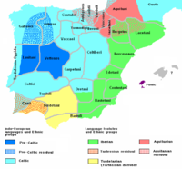 مناطق اللغات الرئيسية في أيبريا, تبين اللغات الكلتية باللون الأزرق, حوالي 200 ق.م.