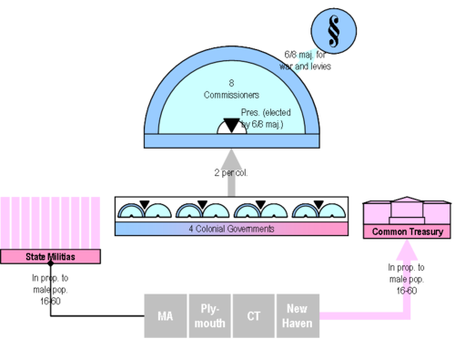 كان هناك اجتماع يُعقد كل عام يحضره مندوبان من كل مستعمرة عضو في الاتحاد لدراسة المسائل ذات الاهتمام المشترك. وكان لهذا الاتحاد الكونفدرالي قوة كبيرة من الناحية النظرية ولكن، من الناحية العملية، لم تكن له قدرة إلا على التشاور، فبناءً على قوانين الاتحاد، كانت هناك ثلاث مستعمرات تكوّن أغلبية حاسمة. وقد حمل عام 1653م اختباراً لقوة هذا الاتحاد الكونفدرالي، وذلك حين أيدت بليموث، وكونكتيكت، ونيوهافن الدخول في حرب ضد هولندا. لم توافق ماساشوسيتس المستعمرة الرابعة ـ حيث رفضت رفضًا باتًا ولم تُذعن. وقد قلل هذا التصرف من هيبة الاتحاد. وفي أعقاب عام 1664م لم يجتمع الأعضاء إلا مرة واحدة كل ثلاثة أعوام، وبحلول عام 1684 انتهى الاتحاد الكونفدرالي. على الرغم من نقاط ضعفه، فقد قدم الاتحاد الكونفدرالي خبرات جمّه فيما يتعلق بالتباحث والتعاون بين المستعمرات، كما ساعد في حماية المستعمرات الصغيرة من الوقوع كليًا تحت هيمنة مساتشوستس.