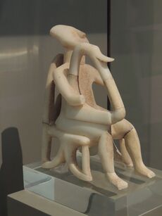 أهم ما يميز الحضارة الكيكلادية من أواخر العصر الحجر الحديث ومطلع العصر البرونزي، هو أصنامها المفلطحة البيانية المنحوتة من رخام الجزر الأبيض النقي قبل الحضارة "المينوية العظيمة في وسط العصر البرونزي والتي نشأت في كريت، إلى الجنوب: هذه التماثيل نـُهبت من المقابر لتشبع نهم جامعي الآثار الكيكلادية منذ مطلع القرن العشرين.