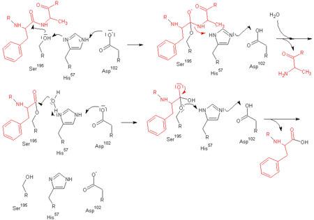 ويفكك كيموترپسن روابط الپپتيد من خلال العمل على مجموعة الكربونيل التى تتفاعل مع نيوكليوفيل فعال، و بقايا سيرين 195 يقع في موقع نشط للانزيم، التي تصبح لفترة وجيزة مستبعدة تساهميا إلى الركيزة، وتشكيل انزيم الركيزة المتوسطة. جنبا إلى جنب مع الحمض الأميني 57 و حمض الأسپارتيك 102، يشكل هذا بقايا سيرين في الثالوث الحفاز من موقع نشط.