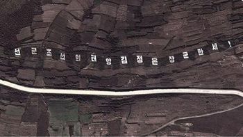 صورة ساتلية لجملة "فليحيا الجنرال كيم جونگ-اون، الشمس الساطعة!" بالكورية على سفح أحد الجبال". ارتفاع كل حرف هو 20 متر. بي بي سي