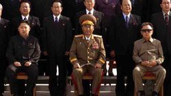 كيم جونگ-اون (اليسار) جالس مع ري يونگ هو (الوسط) وكيم جونگ-إل (اليمين) في 28 سبتمبر 2010، أمام قصر كومسوزان التذكاري أثناء اجتماع حزب العمال الكوري.