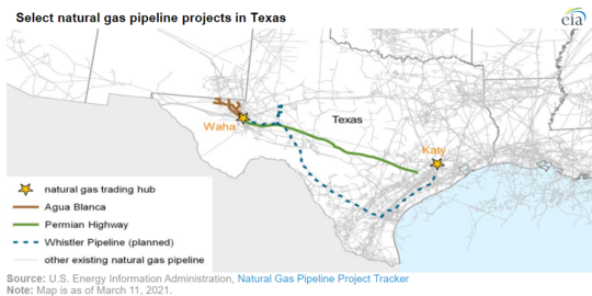 في أواخر صيف عام 2019، أطلقت شركة كيندر مورگان وإيگلكلو ميدستريم وألتوس ميدستريم پروسسنگ أعمال بناء خط الأنابيب الطريق الپرمي، وهو خط أنابيب يبلغ طوله 430 ميلاً ويحمل ما يصل إلى 2.1 بليون قدم مكعب من الغاز الطبيعي من مركز واها في مقاطعة پيكس، تكساس، إلى ساحل الخليج.[37] من المتوقع أن يوفر خط الأنابيب 2500 وظيفة في مجال البناء و18 وظيفة دائمة، ويجمع 42 مليون دولار من العائدات الضريبية السنوية الإضافية للسلطات المحلية والولائية، وكان من المقرر أن يبدأ التشغيل عام 2021.[37]