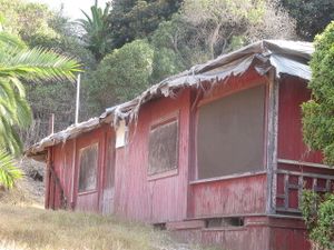 "Red Roost" and "Red Rest", two bungalow cottages built in 1894 on the road above La Jolla Cove. In recent years the cottages have been covered in tarpaulins.