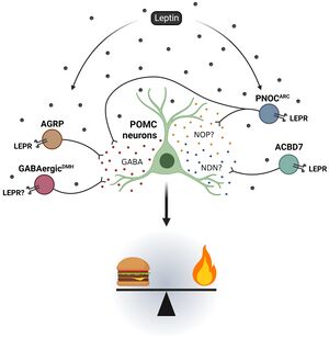 Leptin is coded for by the LEP gene. Leptin receptors are expressed by a variety of brain and peripheral cell types. These include cell receptors in the arcuate and ventromedial nuclei, as well as other parts of the hypothalamus and dopaminergic neurons of the ventral tegmental area, consequently mediating feeding.[3][4]