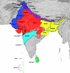 ![]() Geographical distribution of the major Indo-Aryan languages (Urdu is not shown because it is mainly a lingua franca with no prevalence as a first language. Outside of the scope of the map is the migratory Romani language). |