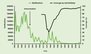 However, negative publicity and fear-mongering caused the immunization rate to fall in several countries, including the UK, Sweden, and Japan. A dramatic increase in the incidence of pertussis followed.[29] For example, in England and Wales before the introduction of pertussis immunisation in the 1950s, the average annual number of notifications exceeded 120,000. By 1972, when vaccine coverage was around 80%, there were only 2,069 notifications of pertussis. The professional and public anxiety about the safety and efficacy of the whole-cell vaccine caused coverage to fall to about 60% in 1975 and around 30% by 1978. Major epidemics occurred in 1977–79 and 1981–83. In 1978 there were over 65,000 notifications and 12 deaths (see the chart of perussis notifications). These two major epidemics illustrate the impact of a fall in coverage of an effective vaccine. The actual number of deaths due to these pertussis outbreaks was higher, since not all cases in infants are recognised.[16]