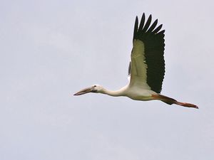 - لقلق منفرج المنقار الآسيوي هو طائر كبير وله أجنحة واسعة وتعتمد على حرارية المنطقة للتنقل. مثل كل اللقالق، يطير مع عنقه الممدودة. وهي صغيرة نسبيا بالنسبة للقلق بطول 68 سم. وهي تولد قرب الأراضي الرطبة الداخلية وتبني عشها بواسطة العصي في الأشجار، وتضع عادة 2-6 من البيض.والبالغين لها ريش أبيض باستثناء الذيل ونهاية الأجنحة فهما سوداوين.أما الساقين فهما ورديين.